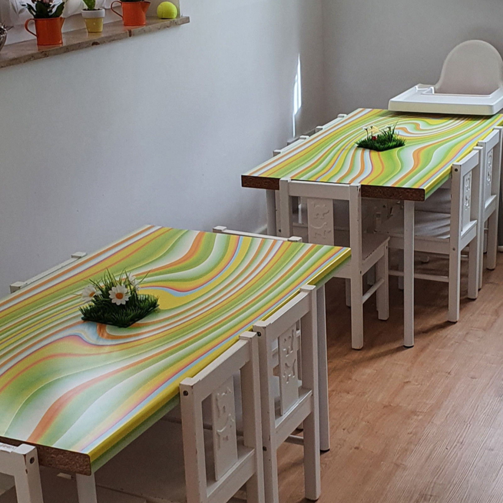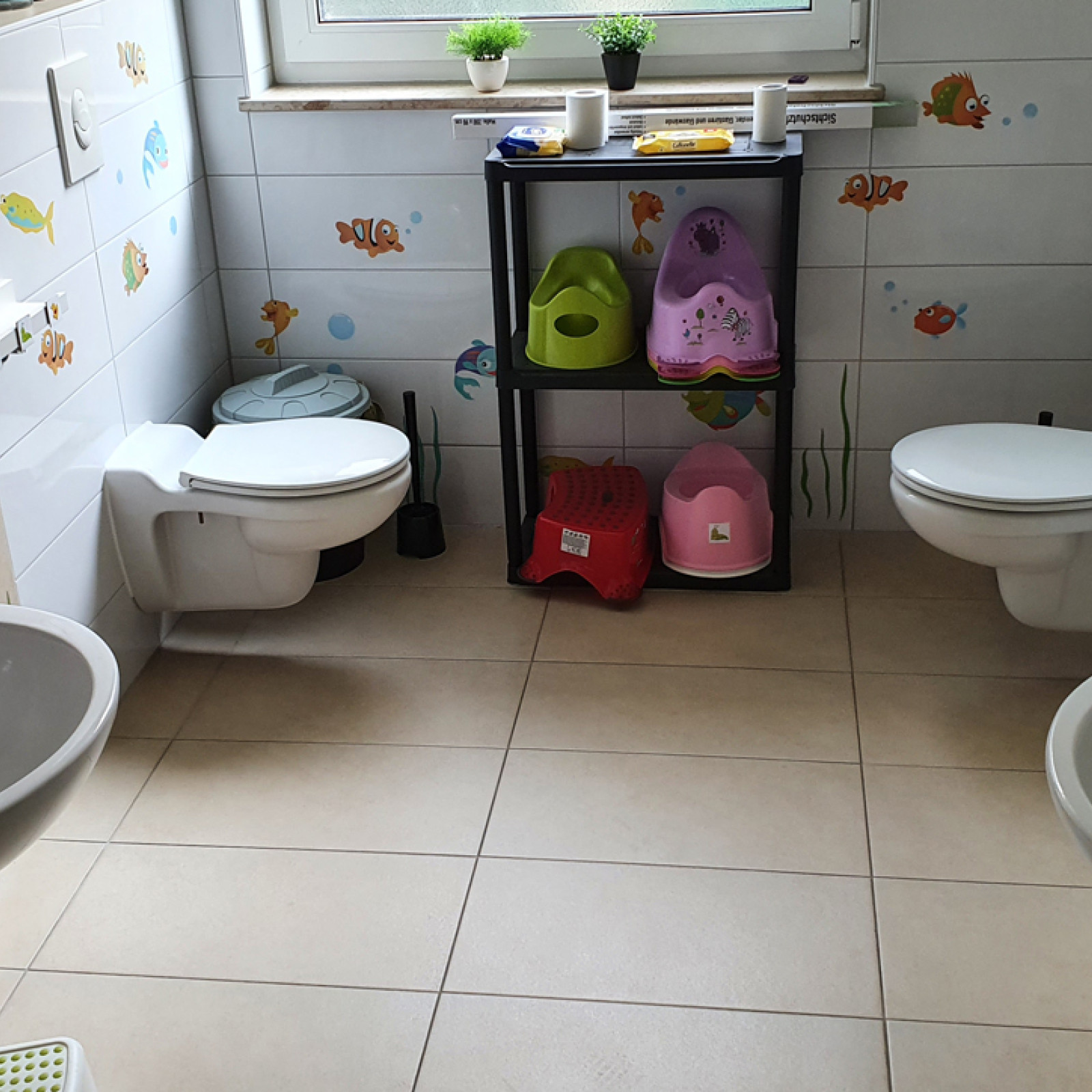Das Bad ist mit Waschbecken in kindgerechter Höhe ausgestattet.